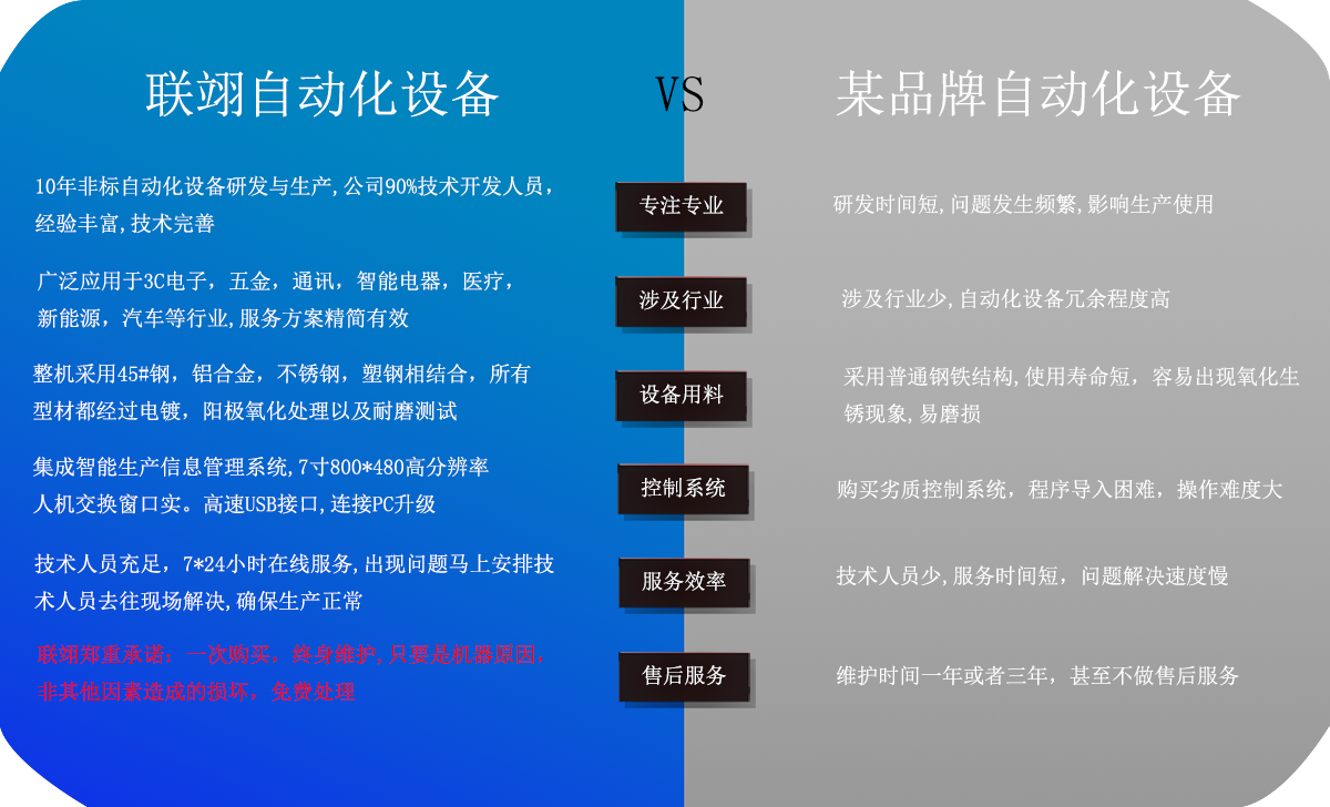 以后再說(shuō)X東莞市聯(lián)翊智能設(shè)備科技有限公司創(chuàng)于2012年,專業(yè)研發(fā)制造自動(dòng)組裝機(jī),自動(dòng)裝配線等非標(biāo)自動(dòng)化設(shè)備.
